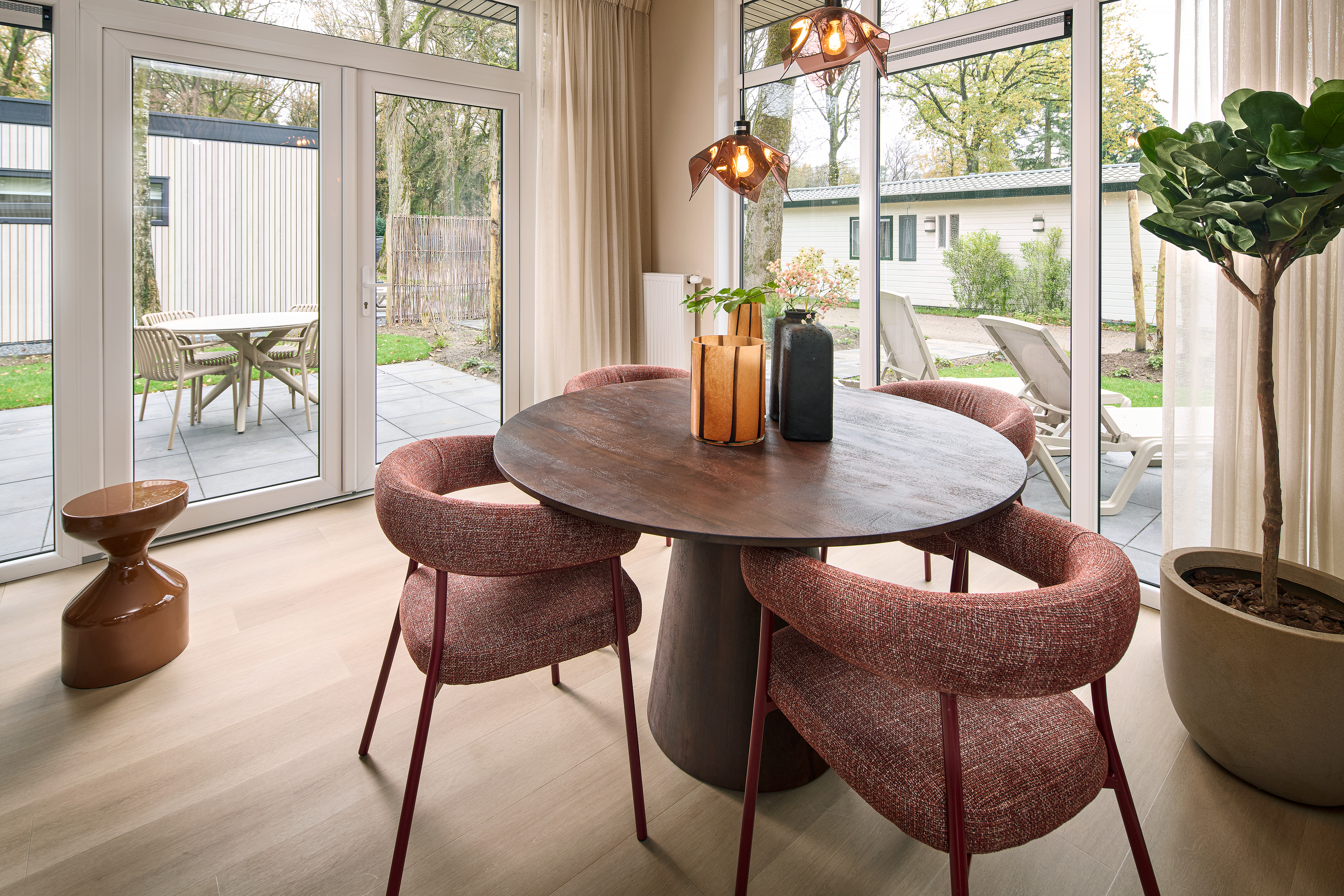 De openslaande deuren geven toegang tot het ruime terras en de natuurrijke tuin; de ideale plek om volledig tot rust te komen op uw eigen plekje op de Veluwe.