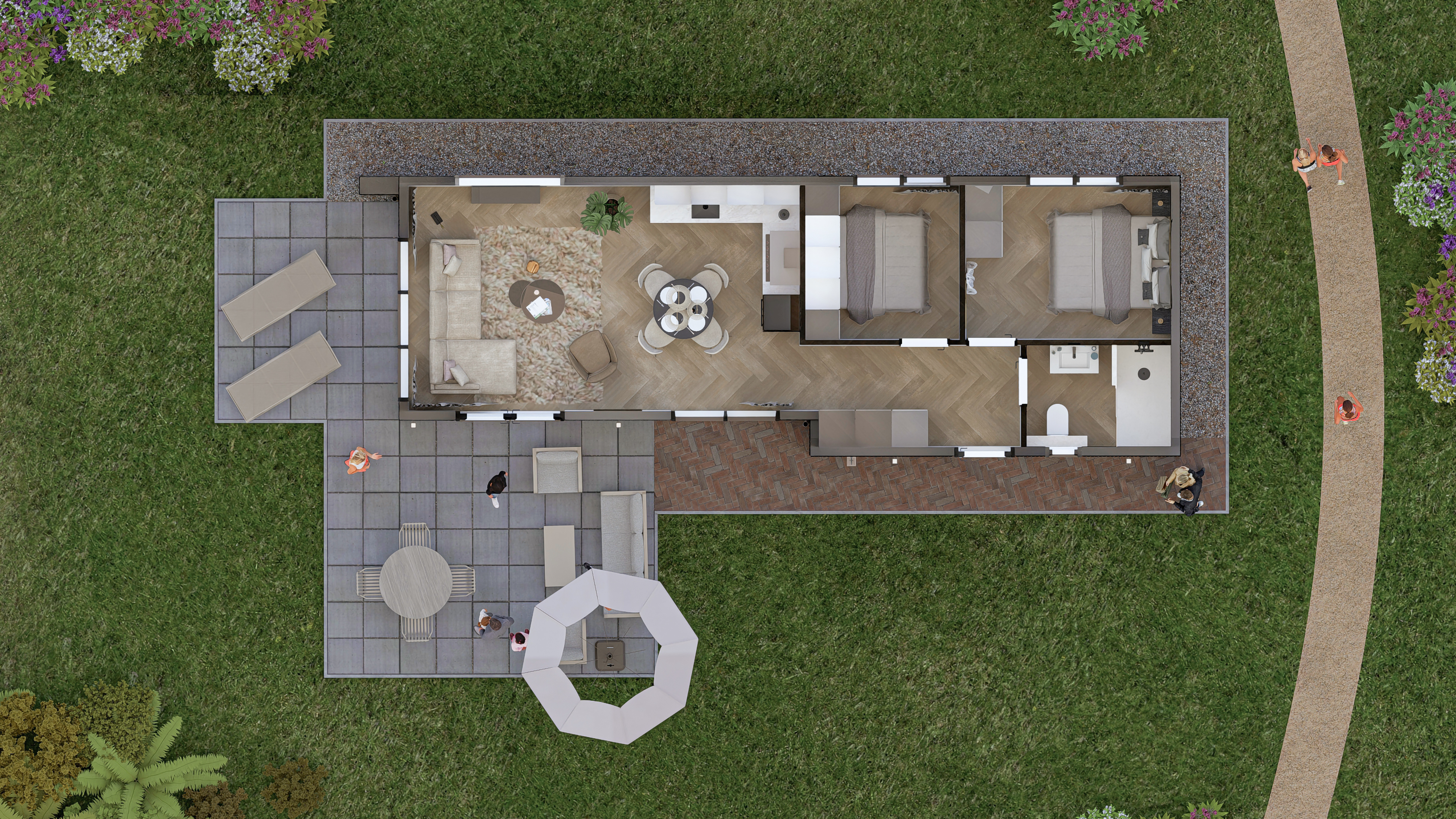 De vakantiewoning beschikt over twee ruime slaapkamers, elk voorzien van twee comfortabele tweepersoonsbedden voor een goede nachtrust. De badkamer is strak afgewerkt en beschikt over een ruime inloopdouche, een wastafelmeubel en een toilet. Door de slimme indeling biedt de woning volop bewegingsvrijheid voor het hele gezelschap.