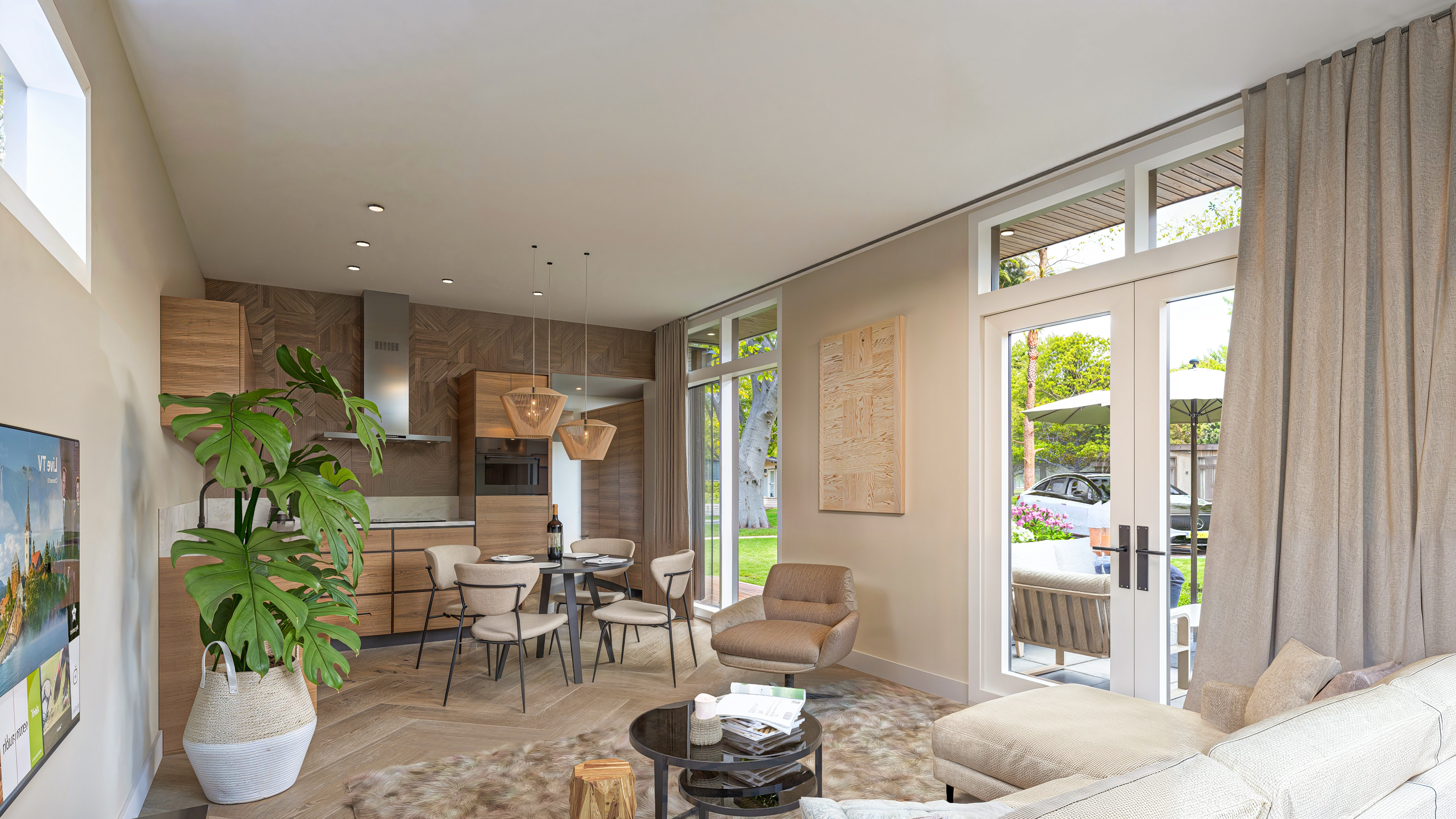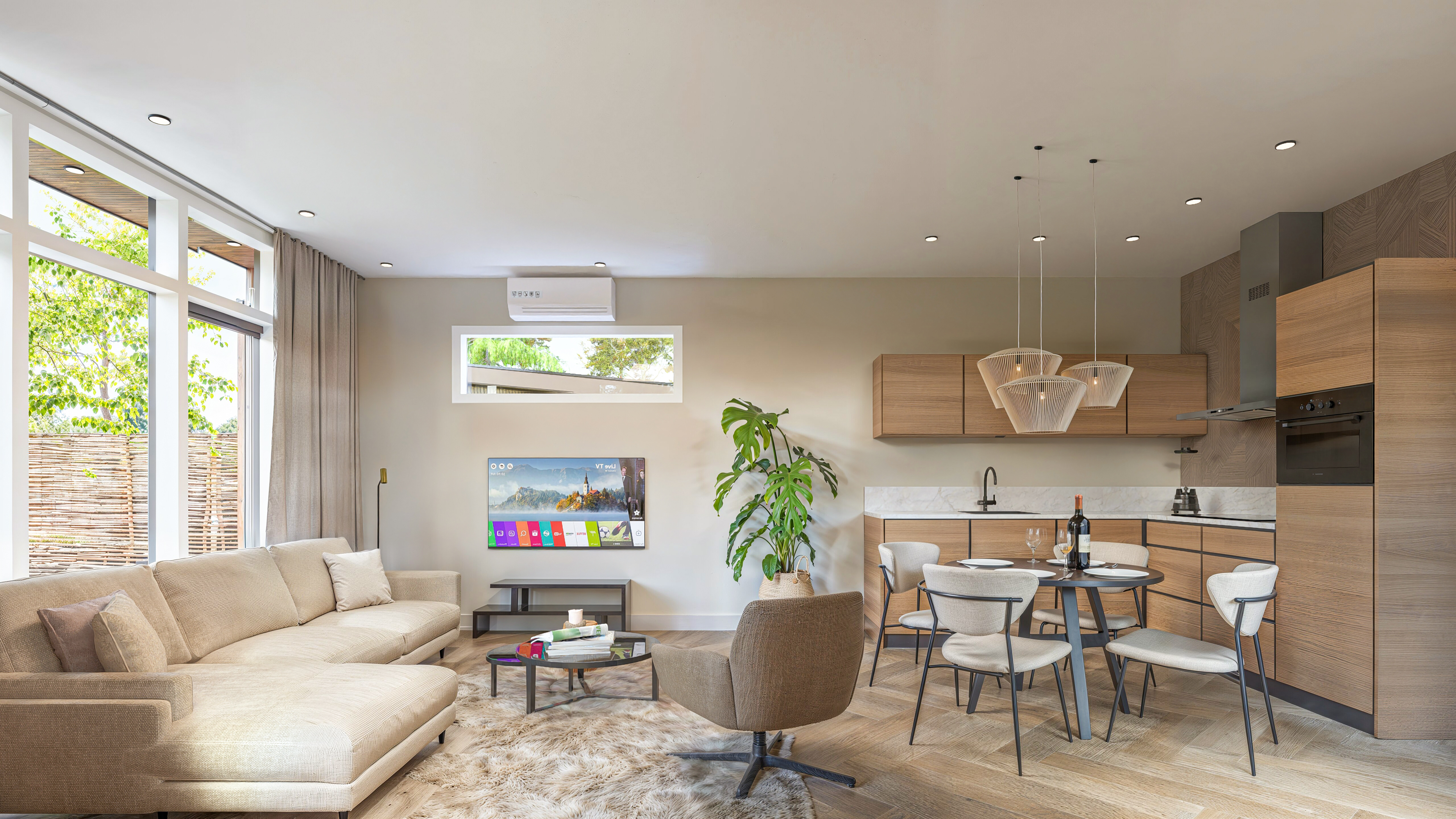 Het leefgedeelte bestaat uit een sfeervolle zithoek en een aangrenzende eethoek. De moderne open keuken is uitgerust met hedendaagse inbouwapparatuur, waaronder een vaatwasser, inductiekookplaat en combimagnetron. Dankzij de hoge ramen geniet u van veel daglicht en heeft u direct zicht op de omliggende natuur.
